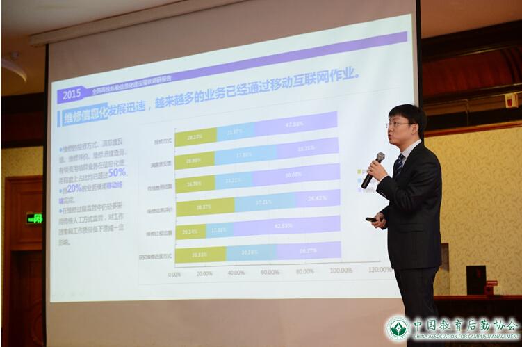 信息化建设专委会常务副秘书长石磊向大会报告了2015年全国教育后勤信息化发展情况,分别对全国教育后勤信息化建设总体情况以及高校后勤涵盖的服务业务进行了数据分析与总结,发布解读了《教育后勤“互联网+”行动计划(2015-2020)》
