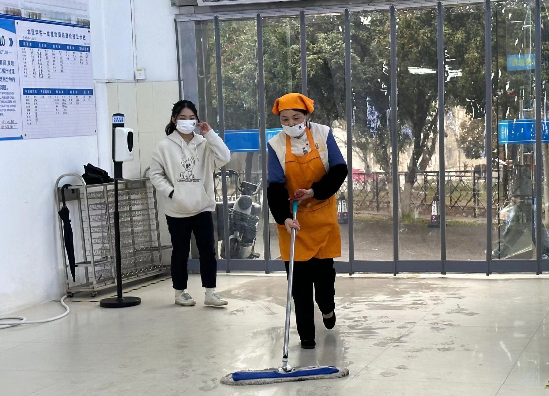 随后,志愿者们在食堂阿姨的帮助下,拿起劳动工具,迅速进入角色。他们有在餐具回收处收餐的,有在大厅擦拭桌椅、清理地面的……大家不怕苦、不怕累,忙得不亦乐乎,尽心尽力满足师生用餐需求。