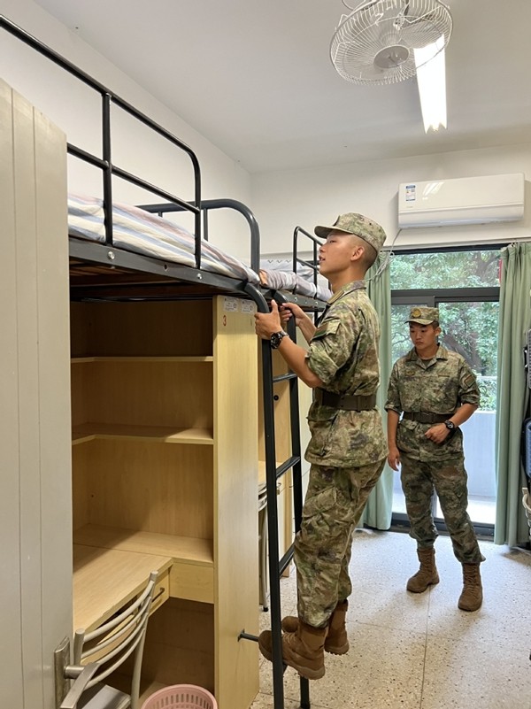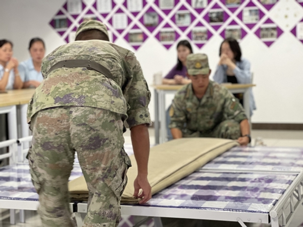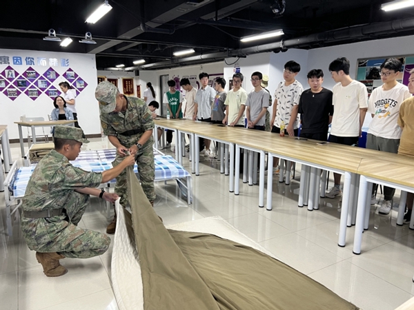 教官介绍军队纪律、军队内务标准,手把手教同学学习如何叠被子、如何整理内务。