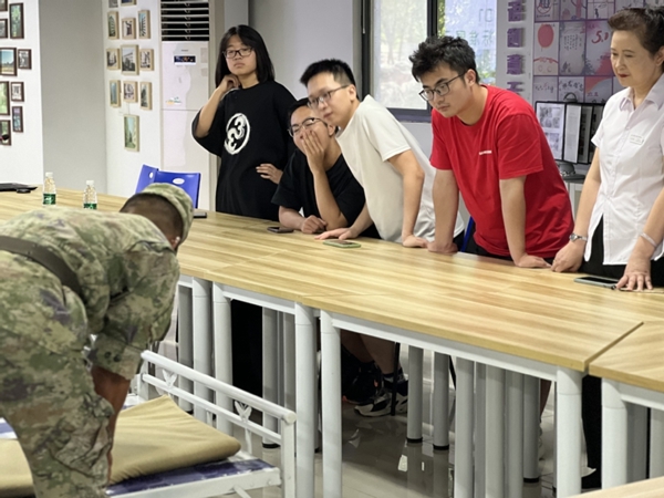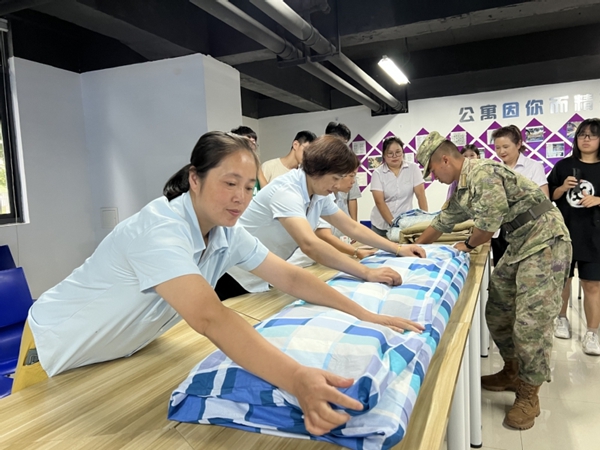 看完教官的示范后,几名学生代表主动尝试,互相协助,反复练习,最终在教官的指导下也能把被子叠得方方正正。