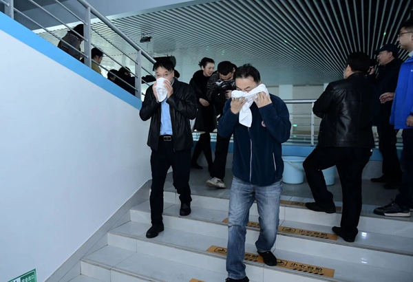 随着应急演练警报声响起,新校区游泳馆内浓烟滚滚,组长发布疏散指令,应急演练拉开序幕。工作人员第一时间切断场馆内电源,迅速组织全体人员疏散。全体人员弯着腰、用手湿毛巾紧紧捂住口鼻,在救生员及前台等工作人员的指挥下,沿着指定安全出口快速前进,有序撤离到安全区域,在较短时间内撤离“火灾现场”。疏散完成后,副组长清点人数确认无遗漏人员并向组长汇报,整个演练过程反应迅速、处置得当,人员疏散及时。