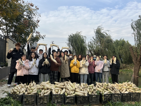 “哇塞,这个萝卜跟我的小腿一样粗诶!”“你们看我拔出来的萝卜像不像胡巴。”“这边这个更大,我拔不出来,快来我帮一把。”东方小菜园里传来阵阵欢呼声。短短一个小时,拔萝卜、择叶子、装筐、搬运,25名外国语学院的师生、物业服务中心的工作人员携手一起收获近1500斤的白萝卜,看得见的成果让大家惊喜满满。随后,这些劳动成果运至一食堂加工成美味的冬季暖身佳品,免费供师生品尝。