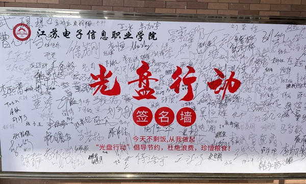 餐厅门口放置“光盘行动”签名墙,来往师生在墙上签上自己的名字,承诺自觉践行“光盘行动”的宗旨,在日常生活中养成珍惜粮食、厉行节俭的好习惯。