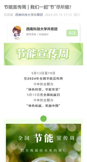 为全面贯彻落实党的二十大精神,深入践行习近平生态文明思想,进一步传播节能降碳和绿色发展理念,2024年5月,西南科技大学结合节能宣传周“绿色转型,节能攻坚”主题,全国低碳日“绿色低碳,美丽中国”主题,积极推进节能减排工作,加强节约型生态环保校园建设工,广泛开展系列节能减排宣传教育活动。