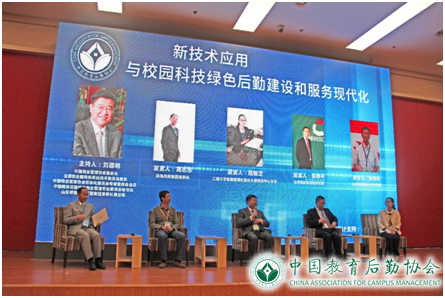 郑广天主持了下午的专题交流会。黄俊鹏、陶宏杰、朱海艳分别以“绿色校园技术应用策略分析”、“国外大学校园服务新技术应用”、“以租代购,金融创新助力后勤装备升级”等主题发表演讲。