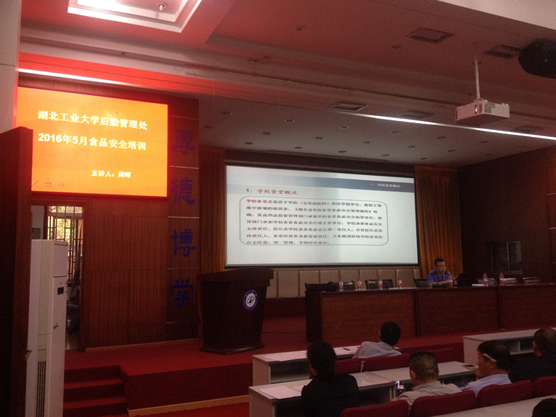 为进一步加强学校食品卫生管理,提高从业人员食品安全意识和服务技能,确保全校师生的饮食健康和安全,2016年5月26日下午,由武汉市洪山区食品药品监督局、狮子山街食品药品监督所、湖工大后勤管理处联合举办的食品安全培训在学校大学生活动中心博学堂报告厅举行,学校食堂、酒店餐饮从业人员300多人、后勤管理处饮食管理科全体监管人员参加了培训。