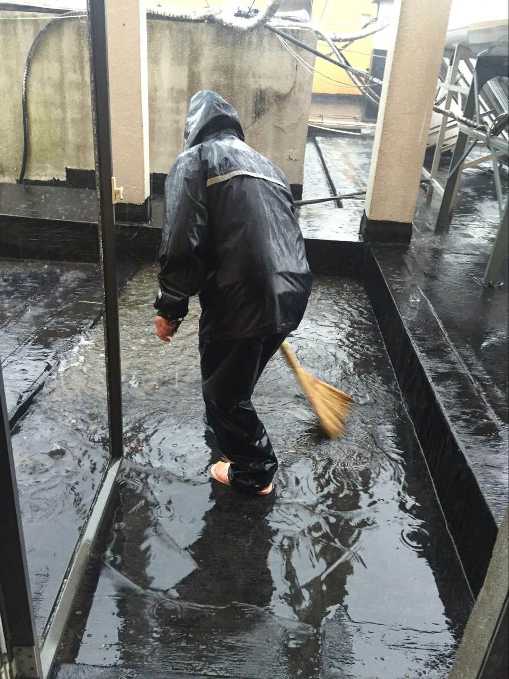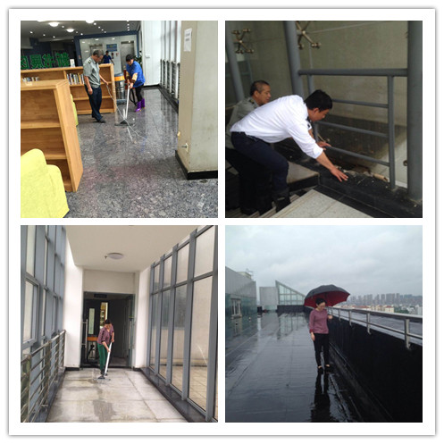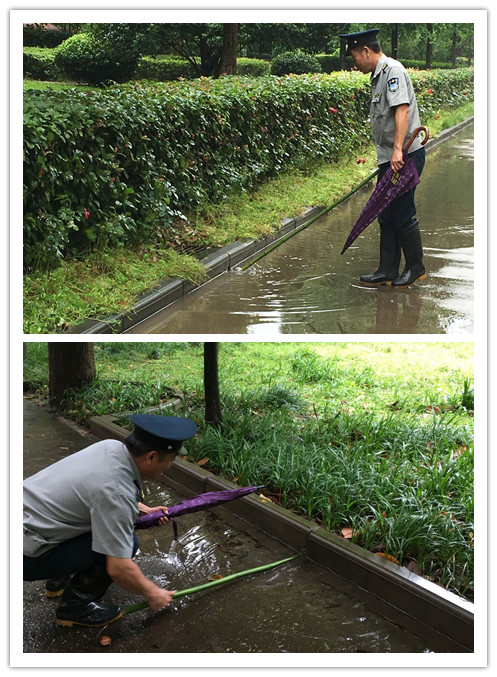 图4 图书馆物业保洁员及时清理室内积水,保安员和物管员关注排水管和天台水沟排水情况