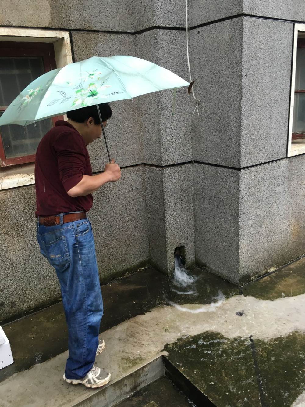 图6 西苑物业维修人员巡查小区楼栋雨水管排水情况