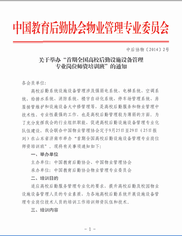 关于举办“首期全国高校后勤设施设备管理专业岗位师资培训班”的通知