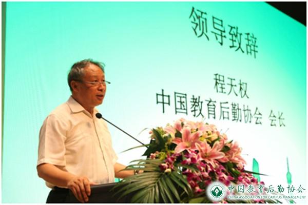 中国教育后勤协会会长程天权讲话。他指出,校园节水•智慧管理•安全供水“最后一公里”交流研讨会(百校行)活动,旨在贯彻落实2015年住建部、发改委、公安部和国家卫生计生委四部委联合发布的《关于加强和改进城镇居民二次供水设施建设和管理确保水质安全的通知》精神,努力解决好城镇供水“最后一公里”的水质安全问题,并且把保障二次供水安全提升到改善民生和国家反恐的战略高度来认识。