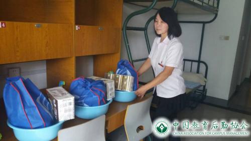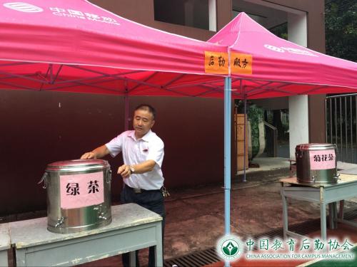 食堂根据军训时间表,延长餐饮服务时间,满足受训学生的就餐需求,还根据天气变化提供姜汤或凉茶;公寓大厅提供爱心小药箱,学生可借用花露水、风油精、创口贴等外用药品;军训现场设立休息点并提供饮用水,还在古荡湾校区军训现场休息点提供菊花茶和凉茶;在超市推出功能饮料优惠让利活动;还为教官提供贴心周到的住宿接待服务,并在教官寝室放置桶装水和饮水机。