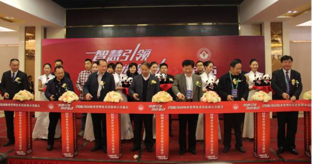 在激情昂扬的音乐声中,中国教育后勤协会会长程天权、中国教育后勤协会副会长兼物专会秘书长朱宝铜、中国教育后勤协会副会长兼秘书长黎玖高、四川省教育厅学校后勤与产业处处长、中国教育后勤协会副秘书长、四川省高校后勤协会秘书长王方文,四川省房地产业协会专职副会长郑友才,中国物业管理协会副会长姚敏,中国教育后勤协会物专会秘书长刘德明以及参展企业代表共同上台,为首届校园物业管理技术设备展示会开幕进行剪彩。