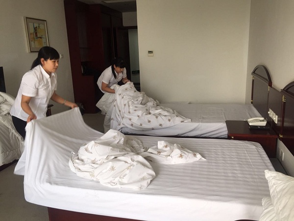 比赛内容为客房铺床操作。参赛选手每人被分配一张待整理床铺,各自独立完成床铺整理流程。评委组对各位参赛选手的操作用时、动作规范、审美效果等进行分项打分,最后统计总分,得出综合名次。经过激烈角逐,赵月琴以总分第一名获得一等奖,充分展示了服务人员良好的精神风貌和精湛的工作技能。比赛现场,评委们认真仔细检查每个细节,对参赛选手娴熟的岗位操作技能、规范的操作程序给予了充分肯定。