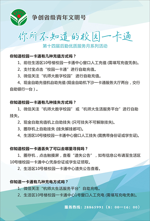 本网讯(傅君丽 通讯员 徐放)随着微信、支付宝的普及,师生充值校园一卡通的方式越来越多元化。为普及一卡通相关知识,方便师生校内工作、学习生活,借后勤优质服务月契机,财务部推出“你所不知道的校园一卡通”主题宣传活动。