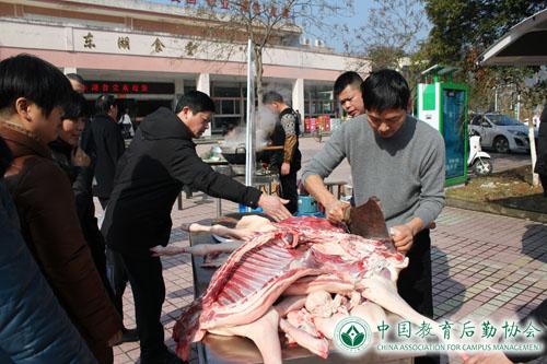 在东湖食堂广场,草猪肉现砍现称,湖羊肉现煮现卖,引得路人纷纷驻足购买,年味十足,好不热闹!同时为了方便离退休教职工购买,联建食堂更是将惠卖点设在了葡萄园社区,惠民的价格、贴心的服务赢得啧啧称赞。