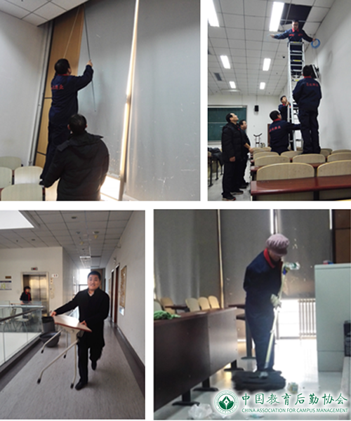 物业工程技术部人员在考前仔细检查各考场内的灯、窗帘、桌椅、取暖设备、天花板、吊顶等各项设施设备,做好检修工作,并从细处着眼,对教室开关门噪音大的地方涂上润滑油。考试过程中,工程维修人员随时待命,为考试工作保驾护航。