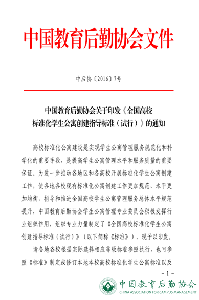 5月20日,中国教育后勤协会颁布了《全国高校标准化学生公寓创建指导标准(试行)》。这是中国教育后勤协会的分支机构——学生公寓管理专业委员会(以下简称寓专会)自2014年6月成立以来,积极发挥行业组织作用,组织专业力量制定的。