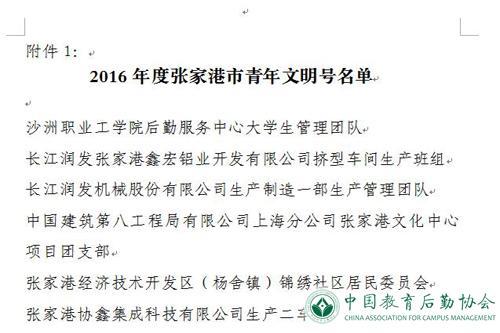 新学期伊始,沙洲职业工学院后勤服务中心大学生管理团队喜获“张家港市青年文明号”荣誉称号。实现“开门红”,为2017年工作注入强劲动力。