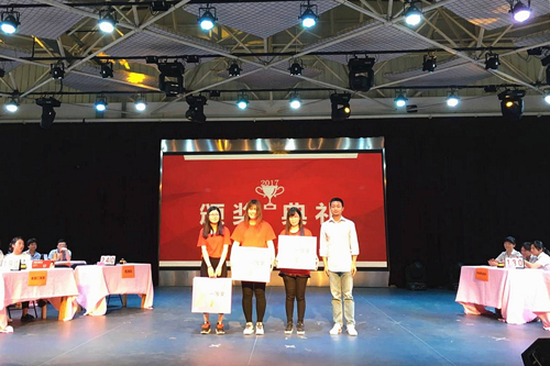 首先,在主持人的引导下,10支参赛队伍逐一进行了风采展示,有趣的队名、响亮的口号,表达了他们必胜的决心。此次竞赛的主要形式为现场竞答,分为“有问必答”、“齐心协力”、“志在必得”和“绝地逆转”四个环节。在“有问必答”环节,各队均展示了自己的实力,指定题目、指定选手的比赛方式并没有将分数拉开太大差距。“齐心协力”环节要求三位选手通力合作,完成难度较高的问答题作答,有的队伍表现镇定、胸有成竹,有的队伍抓耳挠腮、凝思苦想,江宁清真餐厅抽到的题目较难,选手们最终未能达到得分点,与该轮成绩失之交臂,但她们积极坚持到答题时限的比赛精神,获得了现场观众的热烈掌声。本轮比赛结束后,分数逐渐拉开,本部二食堂、和园餐厅代表队暂时获得领先。接着,紧张激烈的抢答题环节开始了,本环节考验选手们快、狠、准的抢答手法,选手们为了抢到题目的回答权都拼尽了全力,各队竞争激烈,观众鼓掌声不断,赛场气氛热情高涨。机关代表队在本轮如鱼得水,三位美女选手机智果敢,兼具速度与准确率,不断赶超对手,获得了比赛的绝对优势。“志在必得”环节之后,比赛的关键环节——“绝地逆转”开始了,该环节为风险抢答题,不仅考验选手娴熟的抢答手法,还对答题准确率有着较高要求,由于选手在之前环节中的出色表现,该轮环节实际是机关代表队、和园餐厅代表队、本部二食堂代表队,三只代表队之间的较量,随着机关选手们的抢眼表现,最终以200分的比分脱颖而出,获得了此次比赛的冠军,本部二食堂、和园餐厅代表队获得了亚军。比赛又随之进行了加时赛,3支三等奖获奖队伍、4支参与奖获奖队伍,随着比赛成绩出炉。