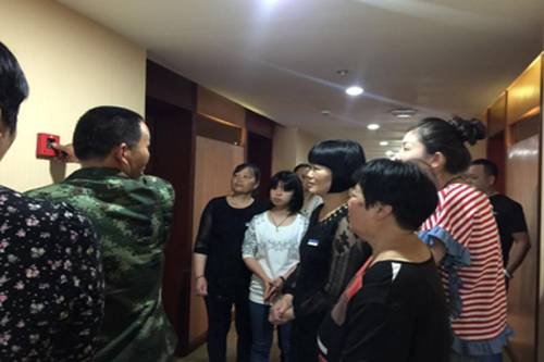 讲座结束后,毛队长作为监督指导人员在学术中心进行了消防演习,本次演习以学术中心客房508房间为火灾发生地点。演习开始,客房部的阿姨作为楼层负责人在第一时间发现火灾并大声叫喊引起上下楼层负责人的注意,然后迅速按下附近的消防警报按钮并且马上拨打校园110通知学校保卫人员进行救援工作,拨打前台电话通知其发生火灾以便迅速组织客人疏散。当火灾第一发现人正在做这些工作时,其余人员听到阿姨的叫喊和警报,到达了火灾现场分工合作。一部分工作人员马上对同层其余客房一一敲门通知客人并引导客人到安全通道逃生,另一部分工作人员打开消防栓用灭火器和水枪扑灭火源,保卫人员到达后由保卫人员接手灭火工作,其余工作人员马上从安全通道逃生,保卫人员灭火搜救工作完成,演习结束。