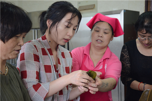 此次培训依然分面点、刀工和烹调三部分,但在授课内容上与前期有所不同。由于此次培训临近端午,因此面点的培训项目就是教大家包粽子。要包好一个粽子可没有吃起来那么简单,糯米要事先浸泡,粽叶要先煮透,而如何将米紧紧地包裹在粽叶里而不露馅确实是门手艺活。师傅手把手地教,学员们一边看,一边自己摸索着。有的将成品赶忙发在朋友圈,有的则为老是漏米而苦恼。在刀工培训中,除了教大家基本的握刀姿势和基础的刀法外,着重演示了冷菜的“盖面”、围、卷等技法,通过精美的刀工成形来使菜肴更加秀色可餐,也让吃饭增添一份情趣。在烹调培训中,教了大家两道时下最流行的“神菜”,香辣小龙虾和诸葛烤鱼。师傅一边演示,学员们认真记录每一个加工步骤,只为在家也能露一手。