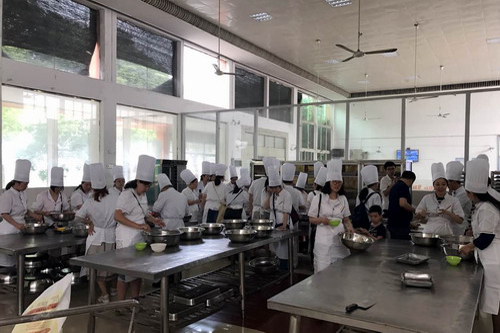 2017年教工厨艺培训班共分为白案和红案两个类别,全校共有270余名教职员工踊跃报名参加,饮食服务中心精心为每位学员准备了理论培训教程和现场操作训练环节。白案培训班主要学习家常小包、玫瑰馒头、花式花卷、油条制作的白案培训,红案班主要是常见家常菜系列刀工、拼盘和烹饪制作培训。为了让学员们充分了解和掌握各种红白案制作手法和技巧,饮食服务中心在二食堂现场设立了厨房讲堂,聘请了我校荣获全国和全省高校烹饪比赛金奖的多位厨师全程指导,为学员们讲解理论知识和现场操作示范,强调做好红白案的关键细节及注意事项,并针对学员们的提问一一解惑。在教工有了一定理论知识了解后,学员们纷纷进入实战演练,现场大厨师傅的示范指导下学员们动手操练,出品后学员们迫不及待地上前欣赏,拿起手机拍下自己的“杰作”。最后,在大家互相品鉴彼此劳动成果的满足感中,首期教职工烹饪培训圆满结束。