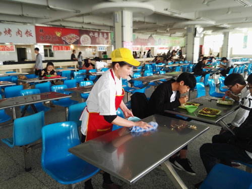 同时,擦桌子的事情她也没有放下。同学就餐结束离桌时,她能及时清理好桌子,方便下面的同学就餐。有时有的同学不小心将菜洒了一地,她却没有露出丝毫厌烦。面对不好意思而连声道歉的同学,她却莞尔一笑,安慰道:“没事的,有阿姨在,阿姨扫一下就好了。”随后,她很有耐性的打扫好地面,一切如就餐前。