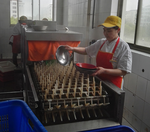 就餐结束了,食堂从嘈杂一下子安静下来,而李阿姨却丝毫没有停下来歇会的意思。餐具的清洗程度决定着餐具是否干净卫生,更决定了我们用餐是否安全健康。李阿姨在清洁餐具时,总是很细心,不急不躁。碗筷勺经过她的手的荡涤,总是很干净,让同学们用的放心。