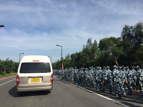 根据军训时间安排,交通服务中心指派特定车辆和驾驶员全程跟随军训队伍,以应对紧急事件的发生。军训期间,学校上空时而传来拉练的口号声和走方阵时整齐肃穆的“踢踏”声。紧紧跟随在队伍旁的是两辆应急“救护车”,像守卫的战士,为学生保驾护航。