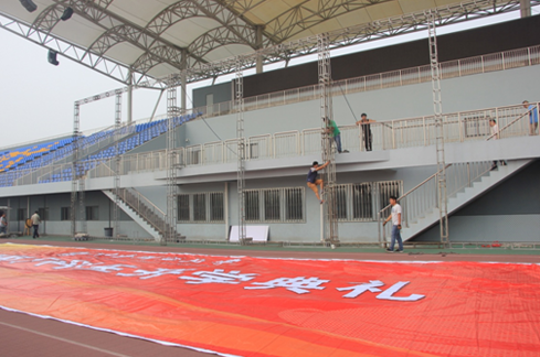 借鉴今年迎新场地布置的经验,昌欣物业在沟通学校相关部门意见基础上,加强展台搭建调研,自迎新结束就开始进行开学典礼主席台搭台和展板设计工作,于9月13日一早开展场地布置工作,物业工作人员不断对施工人员的具体搭建实施工作进行监督,确保场地布置的优雅并保证施工安全作业。物业相关人员提前完成会场音乐和升旗音乐的拷贝工作,为学校进行音乐播放做好前期准备工作。