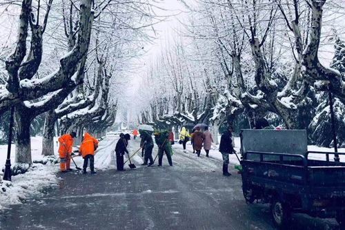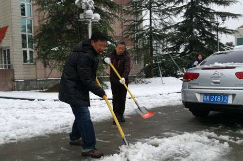 2018年1月4日,扬城迎来了新年第一场雪,扬州气象台升级暴雪黄色预警信号为暴雪橙色预警信号。雪情就是命令,5日一大早,后勤保障处在洪涛副校长的领导下迅速行动,动员全体后勤职工扫雪铲冰。