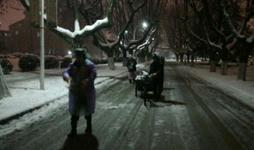 道路清障组充分发挥“不怕苦、不怕累”的物业精神,用铁锹等工具清除路面厚厚的积雪。7点零5分左右,学生公寓至学生食堂至教室等处全线贯通,8点前,学校主干道交通恢复,由于预案有效,处置得当,确保了学校正常的教学和生活秩序。绿化和机动组继续发扬“老园林精神”,在校区主任带领下,冒着严寒,仔细排除安全隐患:一是迅速转移路面断枝,恢复道路通行;二是用预先准备好的竹竿敲打树干、树枝和树叶上的积雪,恢复树形,尽量减少损失;三是将已倒伏的树木进行清理,以便树木的整形恢复。楼宇维护组发扬“老黄牛精神”,在教学和办公场所前的台阶上铺上防滑垫、安排工作人员列岗提醒进出楼宇的师生注意安全、全面恢复楼宇周边秩序。尽管许多同志衣服湿透,鞋子进水,却全然不顾,心中只有一个念头,为确保师生能够坐进温暖的教室按时开课。