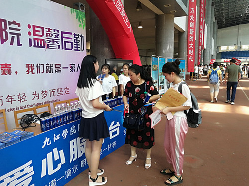 据九江学院后勤管理处饮食服务中心介绍,在九江学院迎新报到现场,后勤管理处专门设立了一个爱心服务台,为报到的新生及家长提供一些力所能及的服务和帮助。天气炎热,爱心服务台提供免费的纯净水服务,还有降温降暑药品,以备新生及家长的不时之需,一袋袋包装好的藿香正气水、风油精、清凉油、午时茶等等,种类不多,却爱心满满。饮食服务中心还为新生家长提供了校园地图,方便新生在陌生的环境下面尽快的熟悉校园。