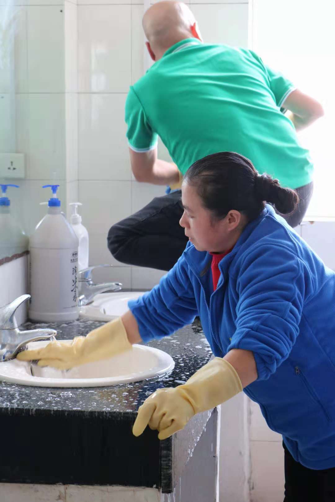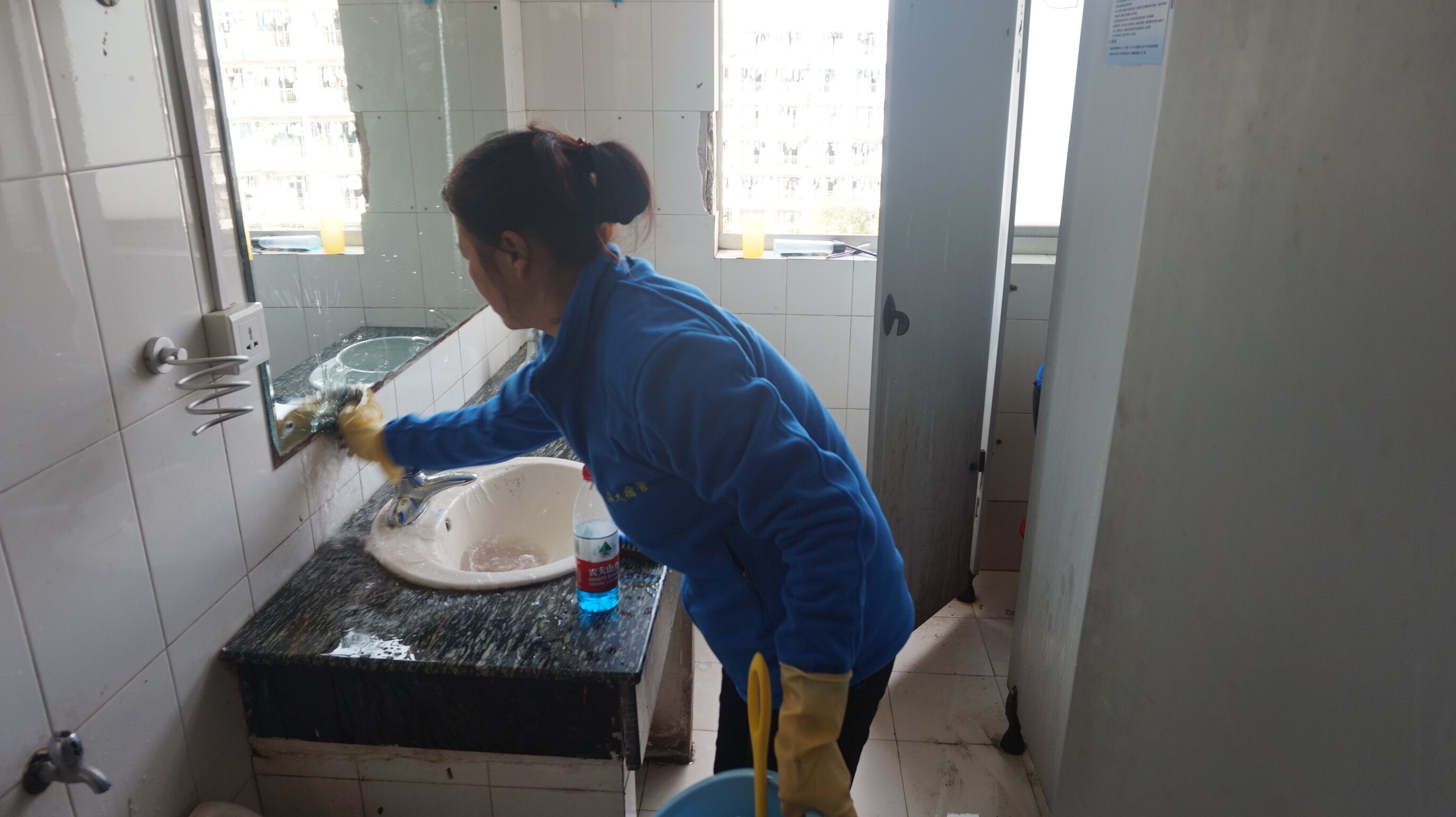 此次比赛按小组进行,各小组按自身所对应的序号进入指定的“考场”。来到“考场”后,我们发现学生宿舍的保洁情况不容乐观。首先地面上全是污水,其次瓷砖等也是布满了各种污垢。但是阿姨们二话不说,立即着手开始干活,纷个个亮出了自己的“十八般武艺”,阿姨们先用长扫帚清扫天花板上的蜘蛛网,然后有条不紊地从上而下,从里到外的开始清洁,同时阿姨们也各自带了自己的“秘密武器”——小铲子,用来铲除难以清洁的污渍,不放过任何一个“脏、乱、差”的角落。从阿姨们身上我们也学到了许多保洁小技巧,例如:利用报纸擦拭玻璃、如何快速、高效打扫卫生等等。