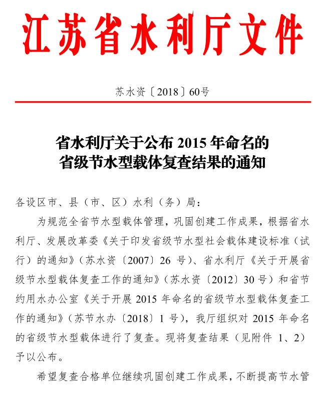 日前,江苏省水利厅发布了《关于公布2015年命名的省级节水型载体复查结果的通知》文件,我校顺利地通过了2018年“节水型高校”的复查验收。