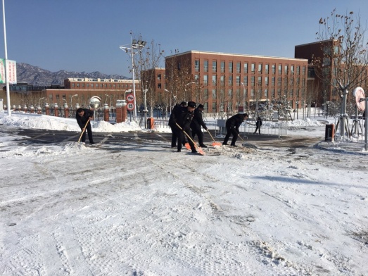 2019年2月14日,北京地区迎来新年的第一场雪,此时恰逢同学陆续返校,为保证校园内道路畅通,校区管理办公室启动扫雪应急预案,采取责任到人、分组、分区域加班加点的方式进行清扫,参加人员约500人次,机械设备18台次。在教师和同学来到学校前,校园主干道及楼宇、园区周边道路的积雪基本清理完毕。后勤人员的辛勤工作恰如初春的阳光,融化了校园的冰雪,也温暖了每个人的心。2019年的新学期即在这样干净安全的校园里拉开帷幕。