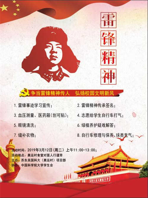 阳春三月,乍暖还寒,春风拂来了学雷锋、树新风的脚步。2019年3月12日11:00--13:00,在国科大奥运村校区食堂门口,在奥运村校区管理办公室的指导下,东吴物业和国科大奥运村校区学生会联合举办了主题为“传承雷锋精神,建设和谐校园”的系列活动。