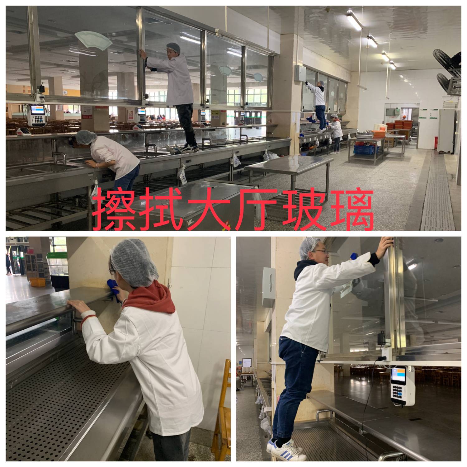 根据本周食堂的卫生工作重点,同学们5个一组被安排在不同的工组进行帮厨。摘菜是传统的帮厨项目之一,同学们俯下身段,专心致志地掐菜苔、去辣椒蒂把、削土豆皮,剥洋葱皮的同学辣得眼泪直流;还有同学在擦售卖台和玻璃,他们或站上高高的台子,或拘在狭窄的售卖台里面,一丝不苟的擦拭着;洗碗间也能看到同学忙碌的身影,他们目不转睛的盯着洗碗机拣碗区,眼到手到,对洗、消后出来的餐具进行严格把关。活动结束,同学们清理各个区域的垃圾,善始善终地做好收尾工作。谈到帮厨体会,不少同学纷纷表示:工作量很大,很辛苦,食堂师傅比我们做的还要多几倍,而且每天如此,真心挺不容易的,给师傅们点赞。
