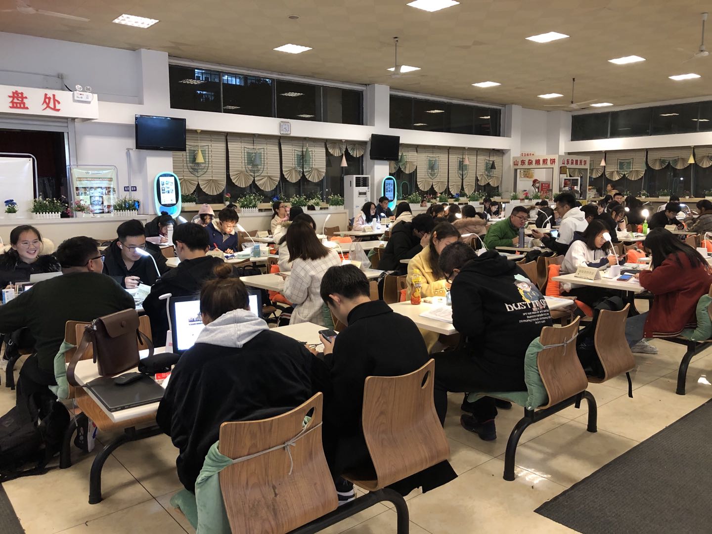 期末考试临近,同学们也进入紧张的复习迎考阶段,为深入贯彻落实“不忘初心、牢记使命”主题教育,后勤服务总公司江宁一餐厅在了解同学们自习座位紧张的情况后,经过一番精心策划及准备,在复习迎考阶段每天晚上19点至22点,开放大厅为学生提供复习场所。