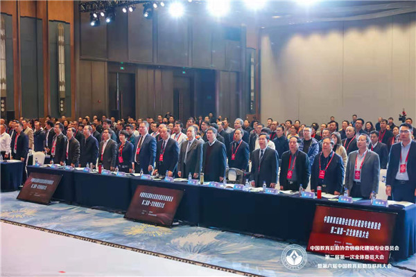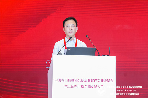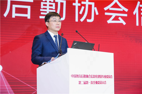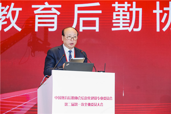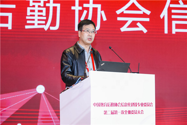 黎玖高首先代表中国教育后勤协会致辞。他充分肯定了第一届信专会的工作,对信专会成立以来取得的成果表示祝贺。他分析了新形势下我国教育现代化发展所面临的挑战和机遇,指出,我国正处在社会主义现代化建设的关键时期,信息技术的不断发展,改革创新的不断深入,都对我国的教育后勤事业提出了更加严格和全新的要求,同时,也为广大教育后勤工作者提供了转变观念,创新发展的绝好机会。教育关系我国国计民生,关系到我国社会主义现代化建设,教育事业要通过实现自身现代化为祖国现代化提供源源不竭的动力支撑,这离不开教育后勤现代化提供的重要支撑。如何促进前沿科技成果与后勤服务有机结合,推动后勤管理服务效率和质量提升,为教育强国战略实施提供强有力的支撑将是新一届信专会全体委员以及广大后勤同仁共同面对的重大课题。他同时也对新一届信专会提出要求,希望新一届信专会与时俱进,再接再厉,始终坚持和加强党的领导,认真学习和深刻领会党的十九届四中全会关于坚持和完善共建共治共享社会治理制度的基本要求,把树立科学理念和创新方法手段的工作指示运用到教育后勤信息化行业组织的工作当中。充分认识到中国教育后勤协会及其专委会作为全国性教育后勤行业性社会组织在维护行业稳定、促进行业健康发展的重要职责和使命。充分发扬校园后勤信息化的科技创新优势,加强自身组织建设,积极推进内部治理体系和治理能力现代化发展;充分调动各委员单位的积极性,发挥各委员单位的重要作用,保障信专会服务能力的专业性和先进性;要确保新一届信专会全体委员尤其是领导班子、常委会成员始终遵纪守法、遵守章程、恪守组织的性质和宗旨、坚持用服务师生、服务教育、服务行业、促进教育事业发展的理念凝聚力量,推进高校后勤信息化建设;同时也要正确履行职责,充分把握时代发展潮流,在切实维护各委员单位利益的同时,规范委员行为,凝聚行业智慧与各方力量,完善信专会管理制度,健全信专会决策执行机制,完善担当作为的激励机制。希望新一届信专会坚持更好服务师生,建设美好智慧校园的初心,保持对前沿科技的敏锐度,在校园信息化建设中不断融入新理念、新思想、新技术,携手并肩,打造共商共建共享共赢的校园信息服务新格局,大力推进教育后勤信息化建设水平提升,为我国教育现代化提供最可靠的强力保障。