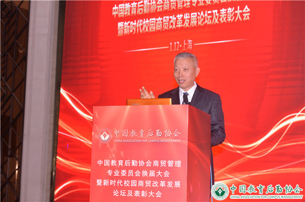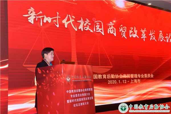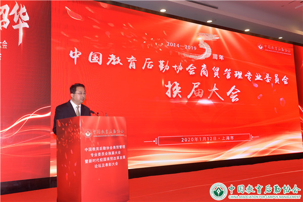 2020年1月11日-12日,中国教育后勤协会商贸管理专业委员会(以下简称“全国商专会”)换届大会暨新时代校园商贸改革发展论坛及表彰大会在上海顺利召开。中国教育后勤协会会长刘建平,中国教育后勤协会副会长兼常务副秘书长黎玖高,中国教育后勤协会副会长、上海市学校后勤协会会长李瑞阳,中国教育后勤协会副会长、复旦大学副校长张志勇等莅临会议。全国部分高校主管后勤工作的校领导、后勤部门负责人、商贸管理专业委员会委员单位及社会服务企业代表等300余人参加会议。