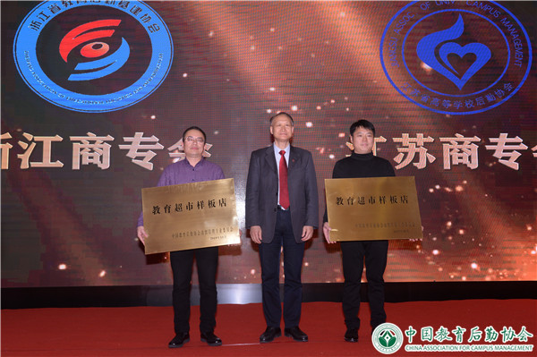 中国教育后勤协会副会长兼常务副秘书长黎玖高为江苏省教育超市南京工程学院店、杭州师范大学教育超市天猫校园精雅店代表授予“全国教育超市样板店”牌匾。