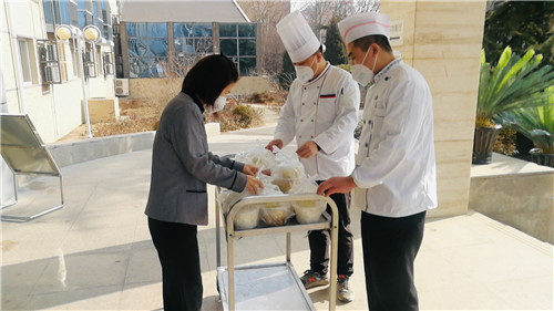 饮食服务中心在多数人员无法返岗、工作人员紧缺的情况下,积极调配、精心组织。在岗职工发扬舍小我顾大家的精神,连续加班加点,保证在校师生每日正常供餐及医疗隔离观察区一日三餐的送餐任务。采购、检疫、库房等部门快速反应,保证物资供应、食品安全卫生。