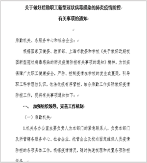 发布防控工作通知。时刻关注疫情发展最新形势,结合后勤保障部实际,制订并发布《关于做好后勤职工新型冠状病毒感染的肺炎疫情防控有关事项的通知》,明确后勤机关、各服务中心和社会企业防控工作的组织领导和工作机制;强化员工进出校园和校内住宿管理,提醒职工不要离开目前的居住地外出旅游或前往疫情发生地,要求确需到校开展管理、服务相关工作的职工,在确保身体状况良好且未离沪、未接触过湖北地区人员的前提下,一律佩戴口罩上岗,并且每日进行不少于2次的体温自测;要求各部门负责人密切关注疫情动态,引导本部门职工正确看待疫情,不信谣、不传谣,树立正确舆论导向。
