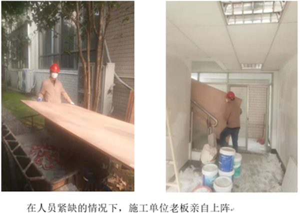 疫情当前,修缮管理办公室和施工单位迅速响应学校关于提前做好疫情预防隔离工作的指示,在关键时刻显示了师大速度和师大效率!面对春节假期的“用工荒”难题,修缮办连夜通知部分施工单位负责人,召集留沪过年、业务过硬、踏实肯干的施工人员组成综合施工队伍。经现场查勘、细化施工方案、明确任务分工、前期材料采购等一系列准备工作后,中山北路校区改建临时隔离用房修缮项目于1月26日下午火速开工。施工期间,面对工期时间紧和材料、人员紧缺的困难,修缮办与施工队伍通力合作,攻坚克难、勇挑重担,放弃春节假期,加班加点,在保证质量和施工安全的前提下,争分夺秒与时间赛跑,最大限度压缩工期,争取在最短时间内完成15个隔离房间的改造任务。施工同时严加防范,指导一线施工人员切实加强个人防护,一律佩戴口罩,定时进行手部清洗消毒,并做好施工现场的清洁消毒工作。截止至129日晚18:00,这幢二层小楼已改头换面,大门、雨棚已更换,一楼淋浴器拆装完毕,所有铝合金门窗及玻璃已修复、配置,所有开水箱电源、水管已就位,所有排气扇、灯管、吸顶灯已调换,所有台盆、龙头、上下水更换完毕,污水管道经过两天时间终于找到并疏通完毕,一、二楼走道、楼梯墙面铲、批已完成,房间涂料、隔断正在进行中。预计整个项目将于25日前完工。