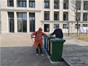 2月4日起,作为一线工作的保洁组在保洁主管周怡宏、物业服务外包经理王杨波的带领下对整个新城校区展开清扫、消毒工作。