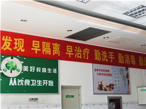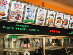 餐厅入口处设置醒目的宣传展板,包括就餐须知、就餐流程、六步洗手法、防护常识等,餐厅内售饭窗口显示屏提示安全就餐六字口诀,移动媒体反复播放就餐须知,墙上悬挂红色宣传条幅,全方位、多角度宣传普及疫情防控知识。