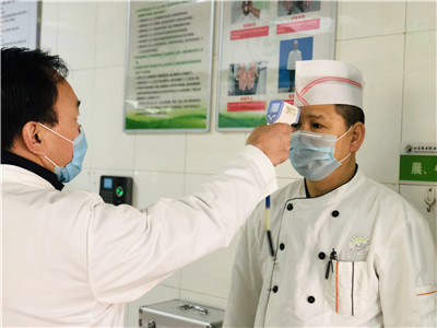 饮食服务中心严格加强工作人员的管理,从各个防控细节入手将防控风险点降至为零。对所有上岗员工实行校园封闭式管理,在防控期间不允许出入校园。返京人员严格进行14天医学观察,身体状况良好方能上岗。将员工宿舍调整为每2人一间,人均面积8平方米,每天对宿舍内进行两次全方位清洁消毒,值班人员严格巡检。所有人员每天自行进行三次体温监测并做好记录,做好个人卫生防护,严格执行“四勤”、“四净”制度,每日上报身体健康状况,确保每名员工身体健康无异常。每天进行两次疫情防控知识的集中培训,提高人员防范意识、普及防控知识、规范操作流程。