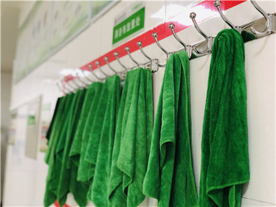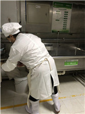 食堂后厨严格实行全封闭管理,装有门禁刷卡系统,非食堂工作人员不得进入后厨。所有上岗人员进入后厨前,先在喷有消毒液的脚垫上进行鞋底消毒清洁,进入后统一更换工服,将私人物品存入专用保管柜。由值班人员逐一进行体温、手指、工装、口罩的检查。工作人员进入售饭间、洗消间要进行二次换装,如厕前后要洗手、更衣,所有工服每天全面清洗消毒一次,确保干净整洁无污染。