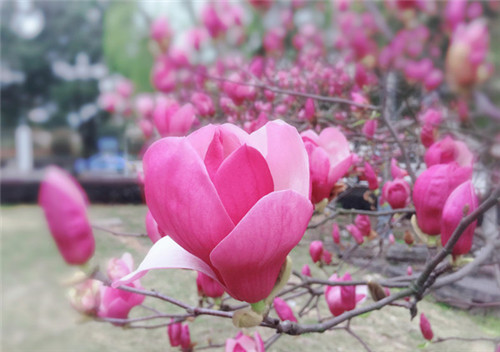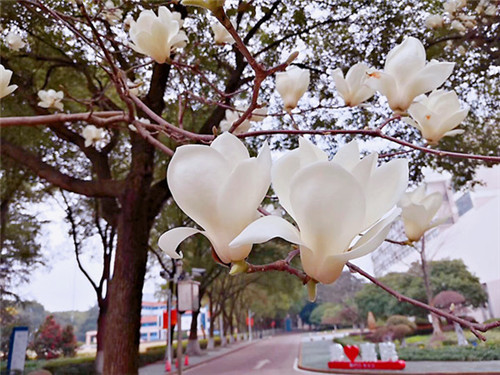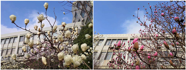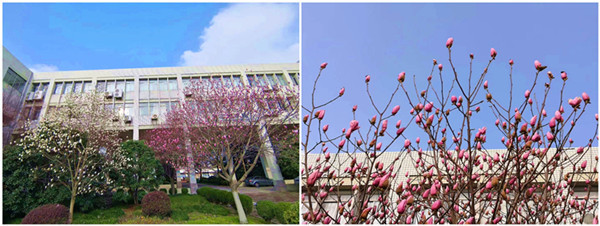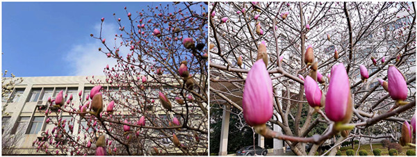 原本到处都是抱着书籍来去匆匆的老师抑或是结伴嬉笑而行的学生的嘉院,如今静悄悄的,鲜有人行,但在嘉院的某个角落,却是一番热闹的景色,桃树、山茶树、玉兰树、梨树等,都竞相抽出花骨朵来,每一个花骨朵都在铆着劲地迎风绽放,仿佛向我们预示着春天的来临。